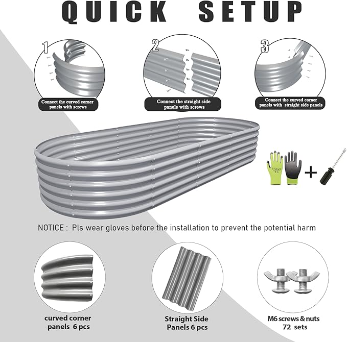 - 【Safety Features】①Anti-rust Coating, do not contaminate soil, safe for plants and humans; ②Oval shape, the raised planter box has rounded corner; ③Thickened crimped edge design, no sharp edges, smooth to the touch; ④ Gloves included; will not hurt your hand when installing or planting